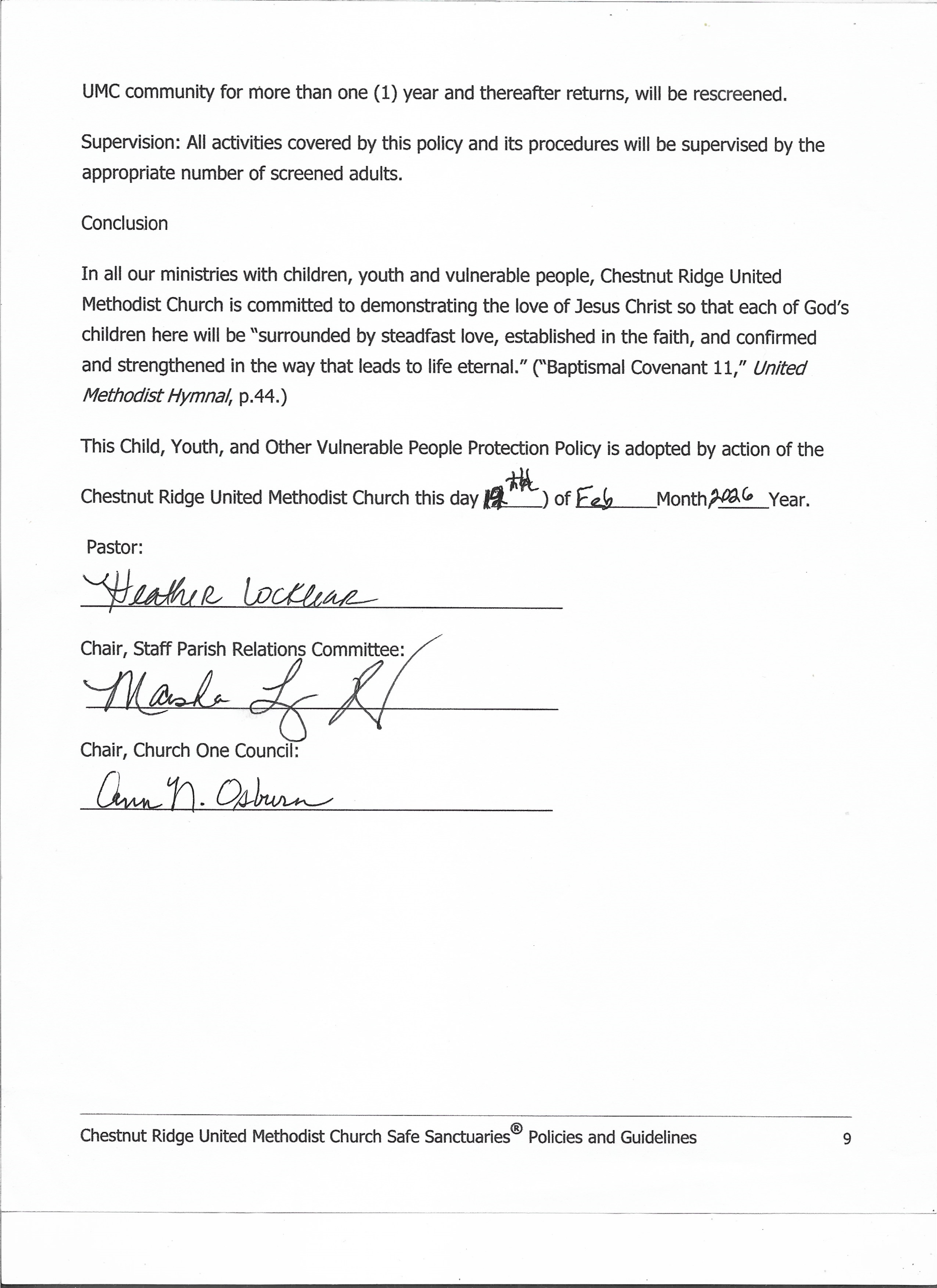 A central tenet of the Christian faith is the inherent value and worth of all: children, youth, and adults. Children, youth, and other vulnerable people are unfortunately least able to protect themselves in our society and are particularly vulnerable to abuse and neglect. The United Methodist Church is eager to do all it can to protect these members who take part in the life of this congregation. These are our policies & guidelines for their care.